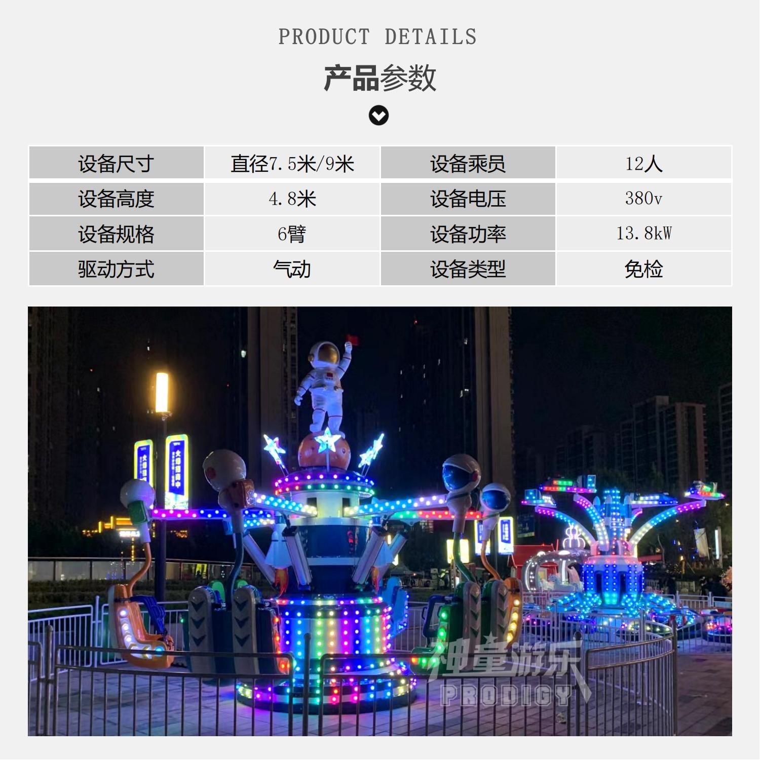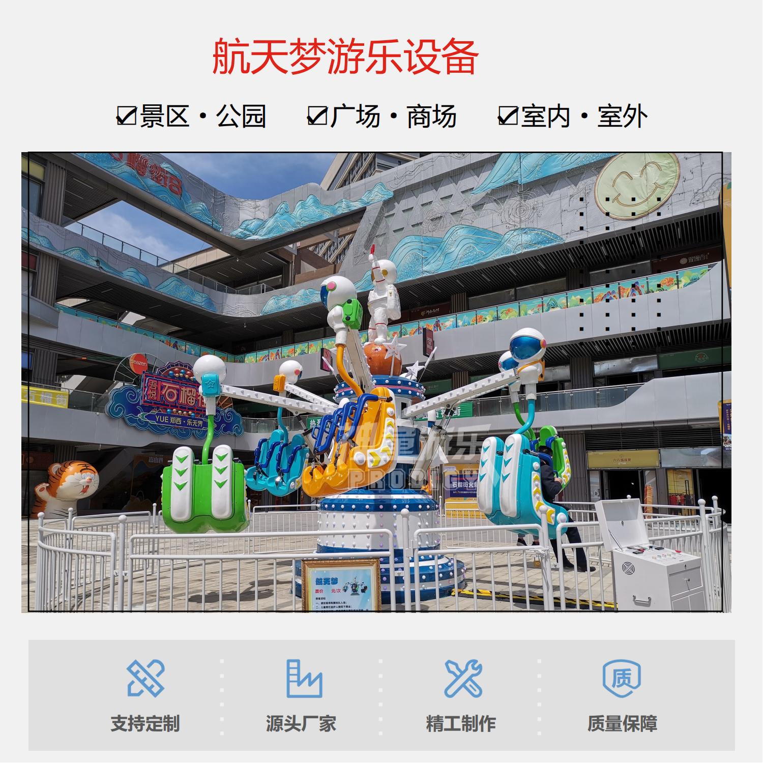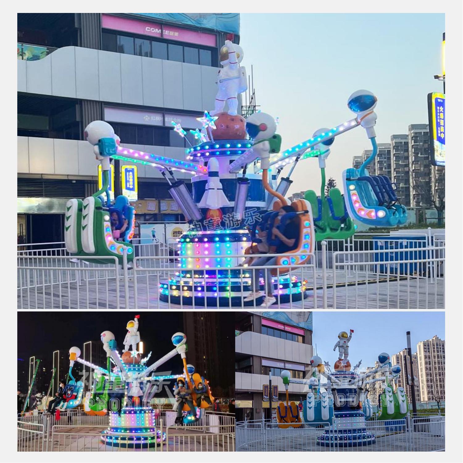 航天夢是由機械、氣動和電氣系統組成,是一種繞垂直軸中心旋轉、升降自由的升降飛機類游樂設備。 雙人親子座艙,游客在飛行跟隨大盤旋轉,座艙會有節奏的彈跳升降和自轉,會有失重感,安全且刺激,令人流連忘返。 航天夢不但性能優異,操作簡單,太空主題非常新穎、華麗迷人的彩燈裝飾,逼真刺激的空戰音響效果,深受大人兒童喜愛。